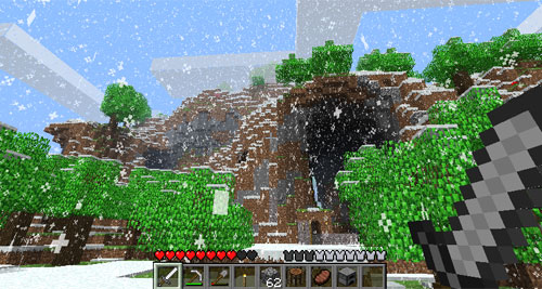 I wandered around for a little while, noticing the sun was rapidly starting to go down. I had heard that night brings monsters, and with no defenses that quickly leads to your demise. I then saw a huge archway of stone that cut a path through the side of one of the mountains. I was impressed with how cool it looked being made completely out of randomly generated terrain. Minecraft’s blockiness lends itself well to this mechanic.