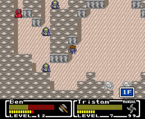 One thing veteran Final Fantasy players will notice, is that you cannot manually setup Benjamin or his companions with equipment. At the start of the game you are given a basic shield and armor. Along your adventure when you find new weapons and armor it automatically replaces the weaker item. For veteran RPG players, this may be considered a travesty, but for FFMQ, it’s linear approach to equipment characterization is seamless. The difficulty of the game relies heavily on how much you grind for levels, thus having stronger stats. This can make the experience a bit bland, but in return, you never have to worry about weather or not you have the right equipment to progress. While Benjamin can carry four different weapon types (sword, axe, claw and bombs), each with it’s own strengths and weaknesses, companion characters always have a set weapon.