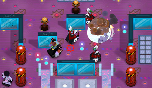 Frobot is a hybrid puzzle/shooter starring one well coiffed little robot on a mission to save his five super fine robot girlfriends. Gameplay takes place in a top down perspective as you solve puzzles and blow up other robots. I’m a little bit Wii-tarded, so any game that requires moving around and using a cursor by aiming at the screen feels off to me. It is even worse when people are watching me try to solve puzzles while I am busy accidentally exploding myself over and over. As a semi-professional games journalist, I managed to shrug off the laughter of onlookers and continued to explode myself in a glorious fashion.