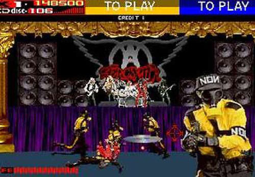 Midway’s Revolution X, our last game of the month, came to the arcades in 1994 and was ported to consoles shortly thereafter by Acclaim. The game was a light gun rail shooter featuring the music and likeness of Aerosmith, a band I’m fairly certain few arcade-dwellers dug at the time of its release. Set in a dystopian 1996, Revolution X puts players in the shoes of someone attending an illegal Aerosmith concert. The New Order Nation (N.O.N.), an evil conglomerate responsible for outlawing most youth-friendly entertainment, catches wind of the concert and sends their troops in to kidnap Aerosmith. Armed with a trusty gun that shoots CDs, you embark on a mission to save Aerosmith and end N.O.N.’s tyrannical reign.